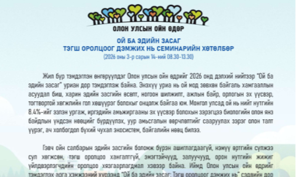 Энэ өдөрт зориулан “Ой ба эдийн засаг” сэдэвт “Монгол орны ойн салбарын бодлого, шинжлэх ухаан, технологи” үндэсний VII хурал 2026.03.21-нд зохион байгуулагдлаа.